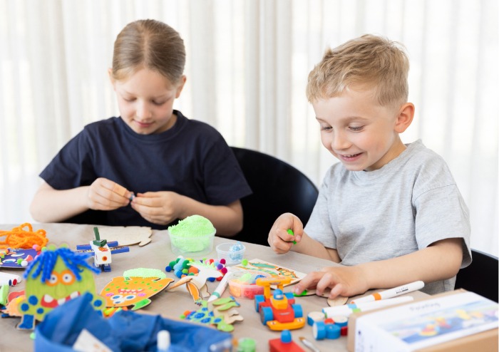 Til lidt større børn kan tekstildekoration suppleres med små detaljer som filt, glitter clay, glimmer og andre dekorative elementer, der giver mulighed for at lege med struktur og overflade. På den måde udvikler tekstildekoration både kreativitet, finmotorik og selvtillid – i barnets eget tempo.